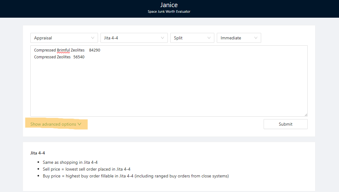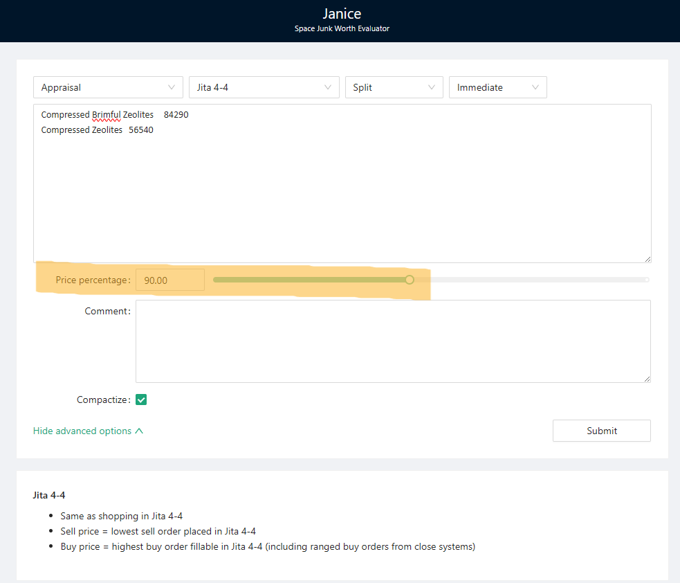 To create a buyback contract, you first need to appraise your items. To do this, we ask that everyone use https://janice.e-351.com/. Paste your list of items into the site, then use the ‘Show advanced options’ tab to change the ‘price percentage’ to the relevant %, as shown below.